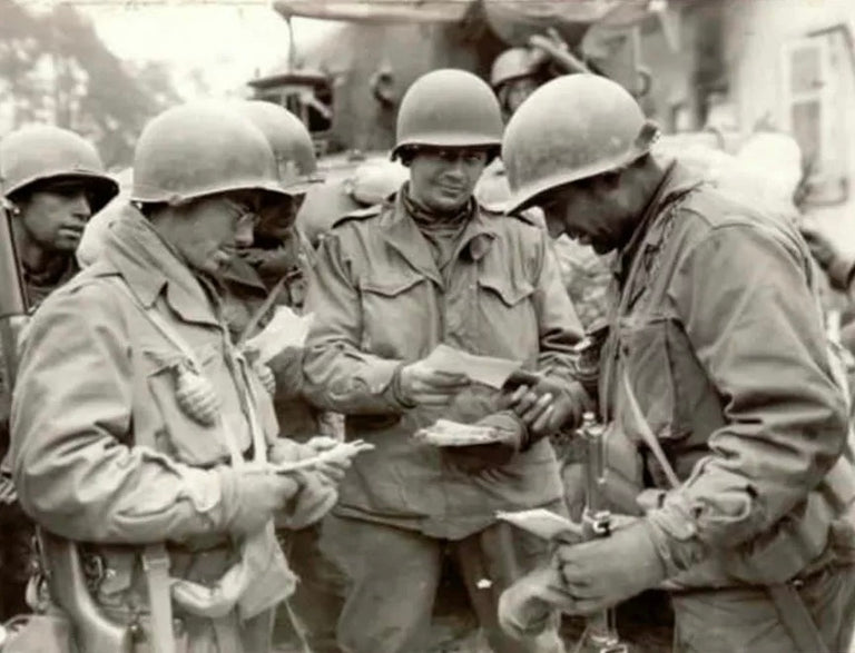 The iconic M-43 field jacket, standard issue for US Army troops in WWII, was chosen for its versatile comfort in mixed conditions, including rain. It was used as an exterior shell, with layers underneath, in Winter.