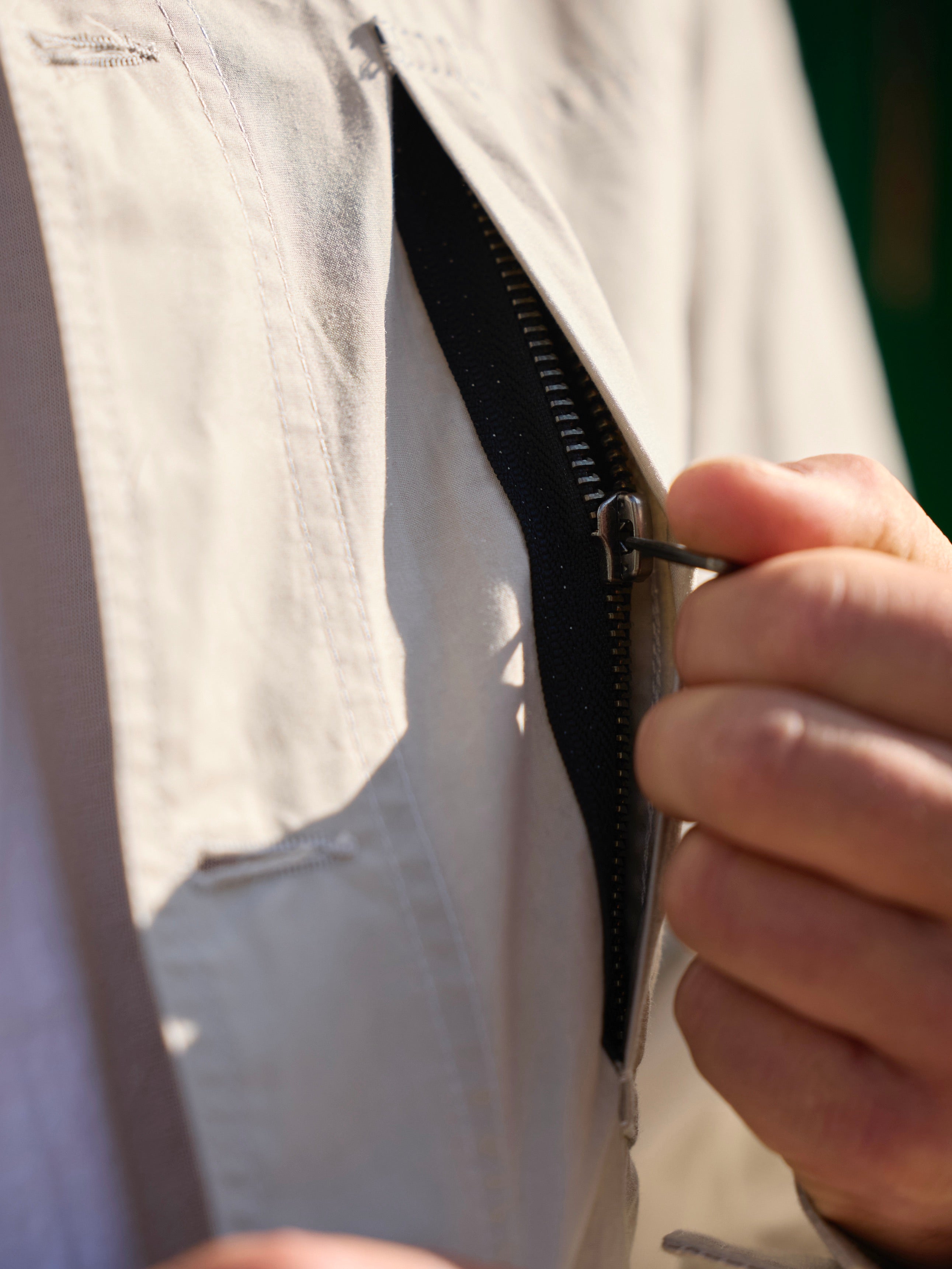 Tough, casual, lightweight upgrade of the classic chore jacket, with subtle details. Built with Halley Stevensons dry waxed cotton, for travel or the office.