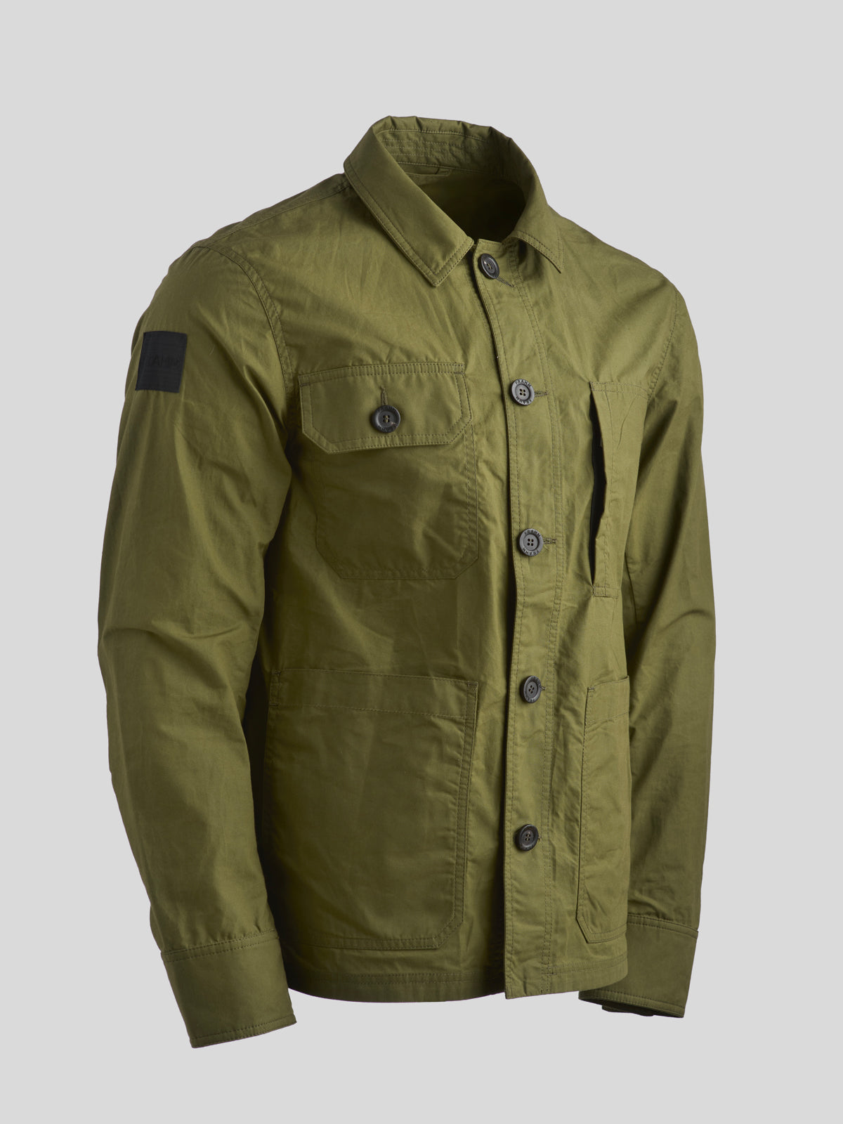 Tough, casual, lightweight upgrade of the classic chore jacket, with subtle details. Built with Halley Stevensons dry waxed cotton, for travel or the office.
