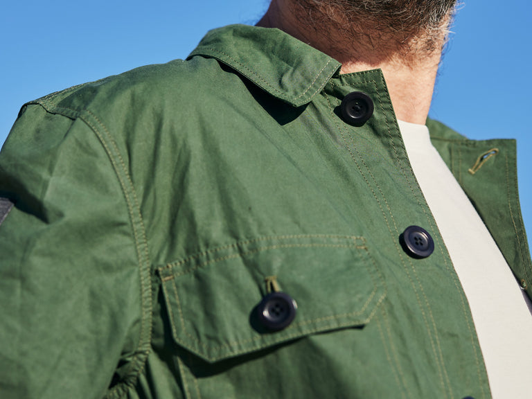Tough, casual, lightweight upgrade of the classic chore jacket, with subtle details. Built with Halley Stevensons dry waxed cotton, for travel or the office.